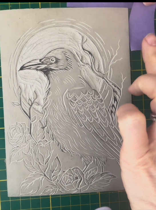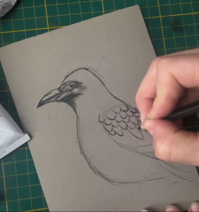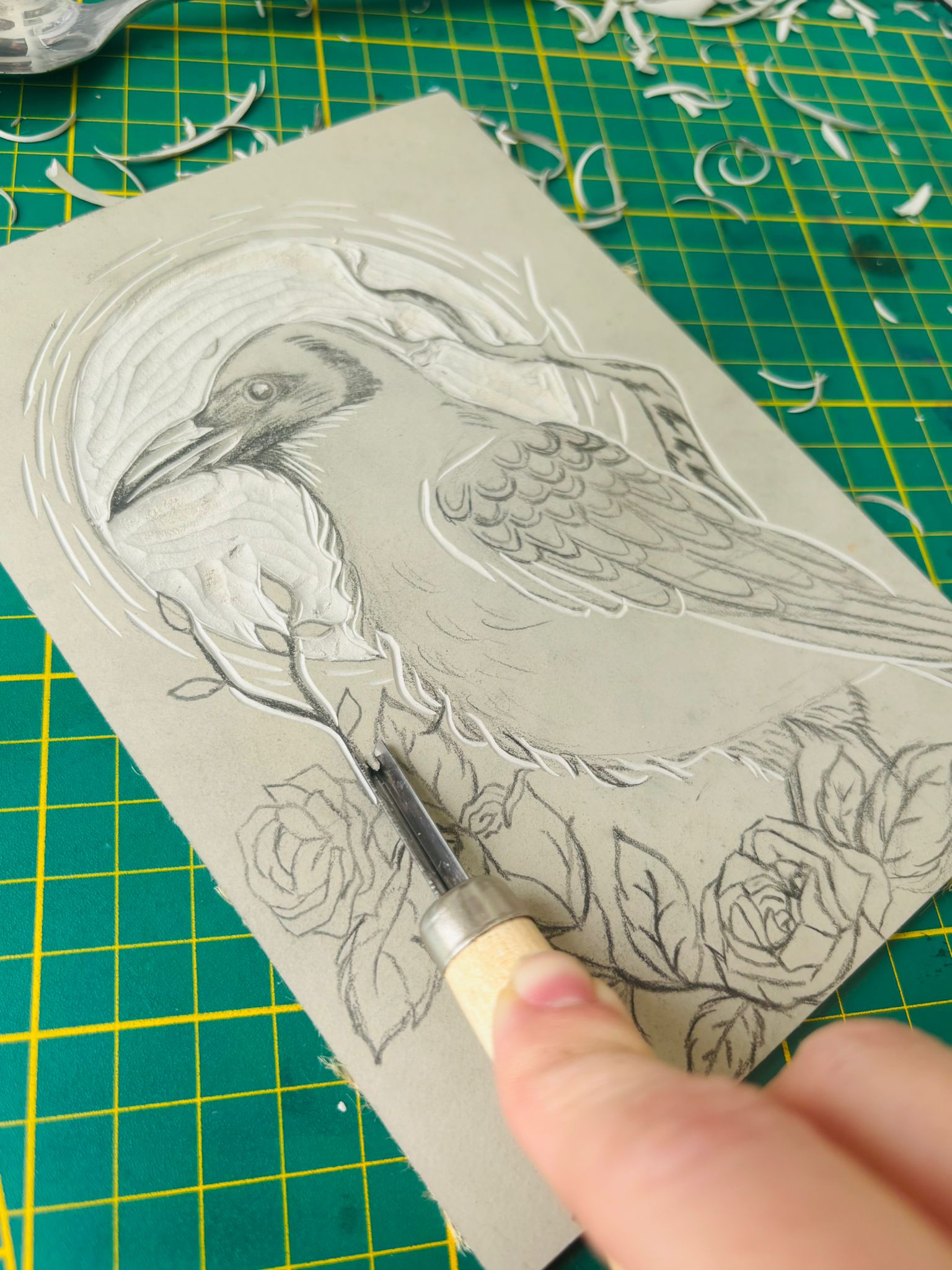 Tout d’abord commencez par dessiner directement sur votre plaque de linoléum ou utilisez un calque pour reporter votre illustration de corbeau.