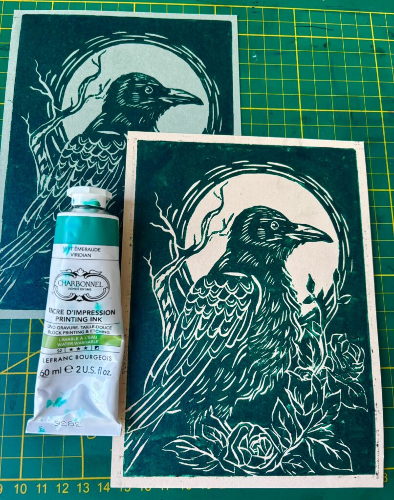 Pour suivre toutes les étapes de la linogravure Halloween afin de réaliser votre corbeau avec les encres Charbonnel, découvrez le tuto complet de Tiphanie ArtClay