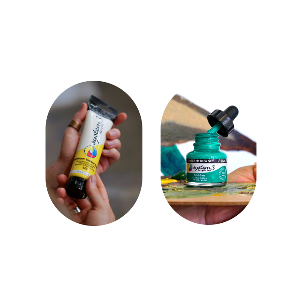 La gamme System 3 en acrylique repose sur deux approches complémentaires qui répondent à des besoins artistiques différents. Peinture et encre offrent des usages spécifiques tout en restant parfaitement compatibles dans une même création.