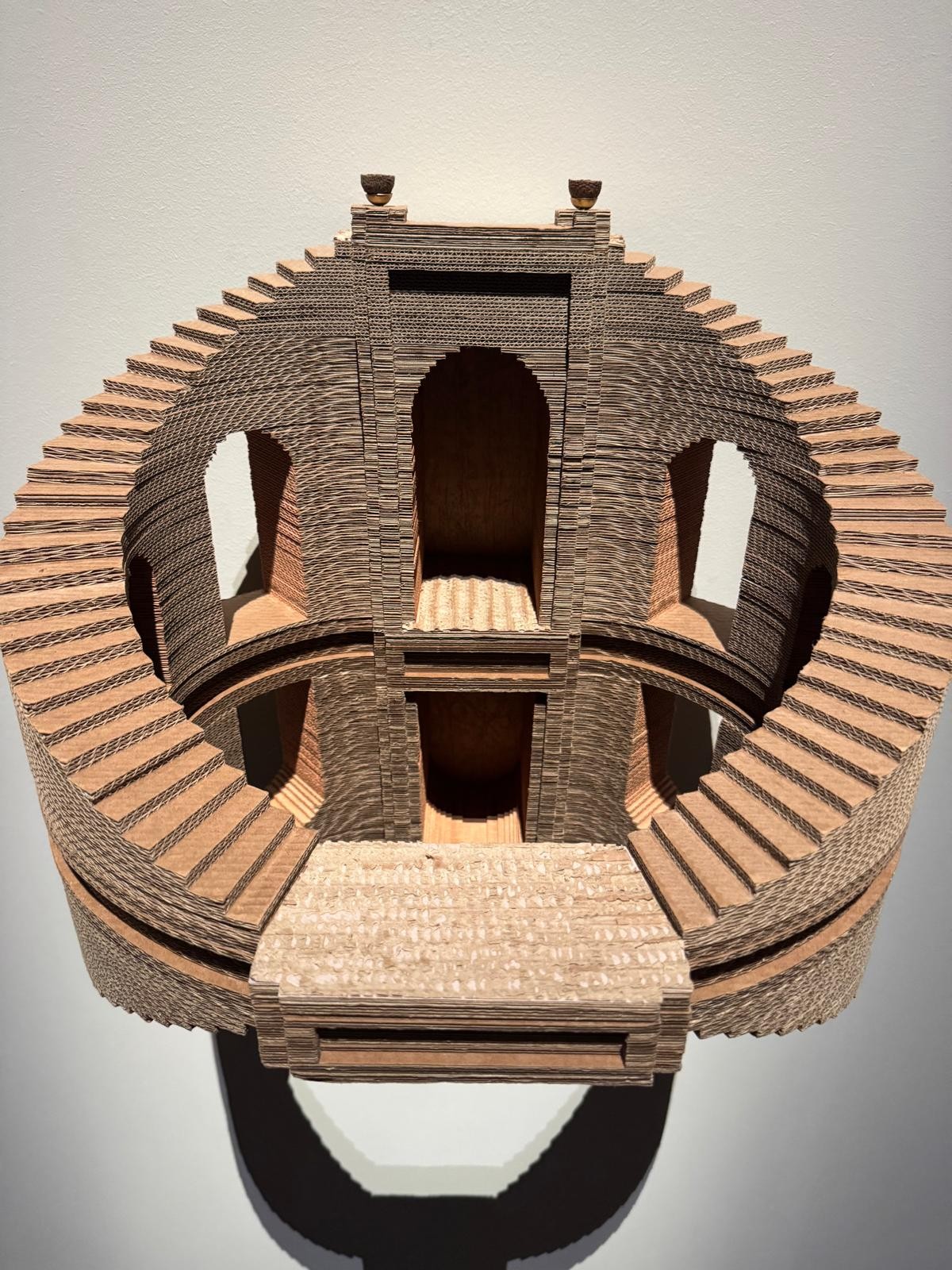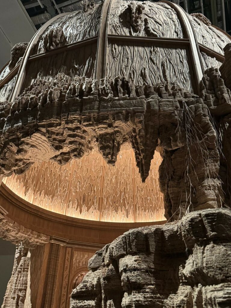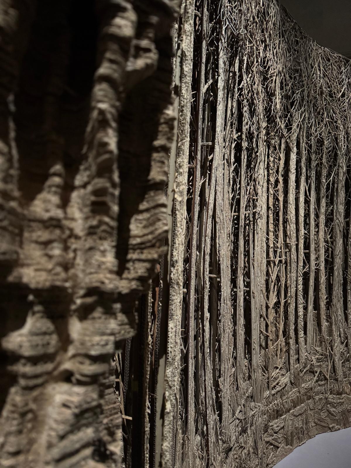 Dans Grottesco, Eva Jospin propose un univers de forêts, grottes et architectures imaginaires. L’artiste utilise le carton, le bois et la broderie, créant des constructions à la fois fragiles et monumentales. D’ailleurs, certaines œuvres ont été conçues spécialement pour cette exposition. Le titre fait référence à la légende d’un jeune Romain découvrant par hasard les fresques de la Domus Aurea, à l’origine du style grotesque.