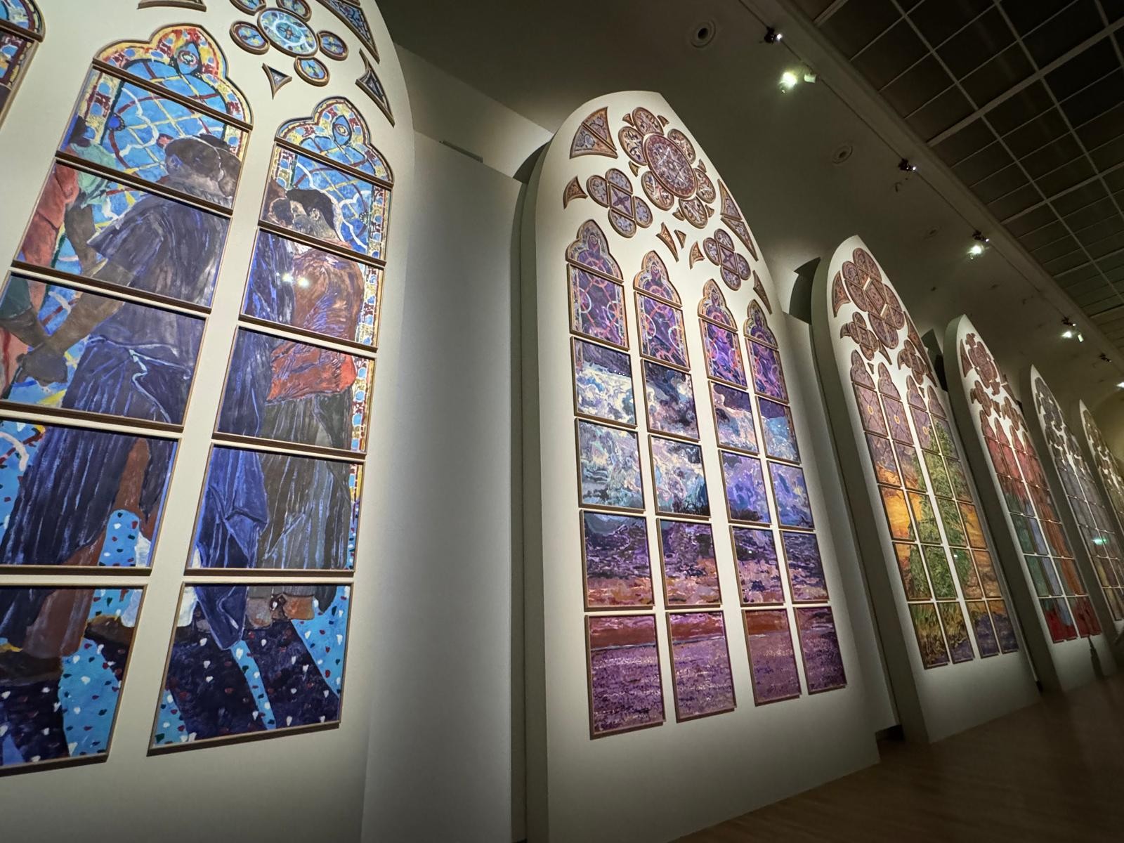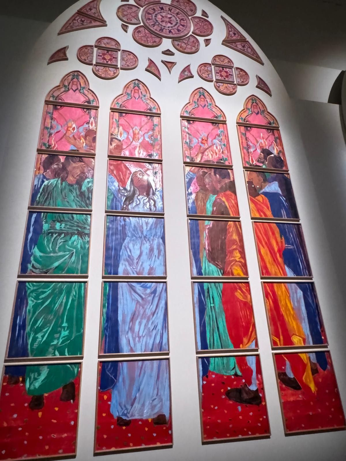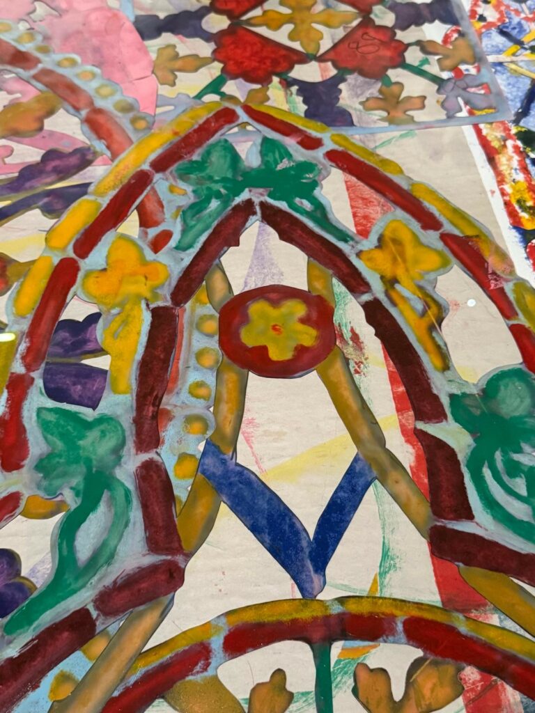 Ces vitraux, inspirés par l’épisode chrétien de la Pentecôte, sont réalisés en monotype et enrichis de pochoirs, offrant des couleurs harmonieuses et adaptées à la lumière neutre de l’édifice. Par ailleurs, l’exposition révèle comment tradition et création contemporaine peuvent dialoguer dans un projet monumental.