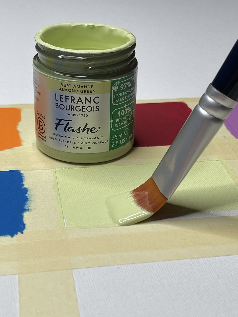 Ainsi, la flashe biosourcée Lefranc Bourgeois intègre un liant biosourcé à 97 %. Elle est fabriquée en France et conditionnée dans un pot de 75 ml conçu en plastique recyclé et recyclable.