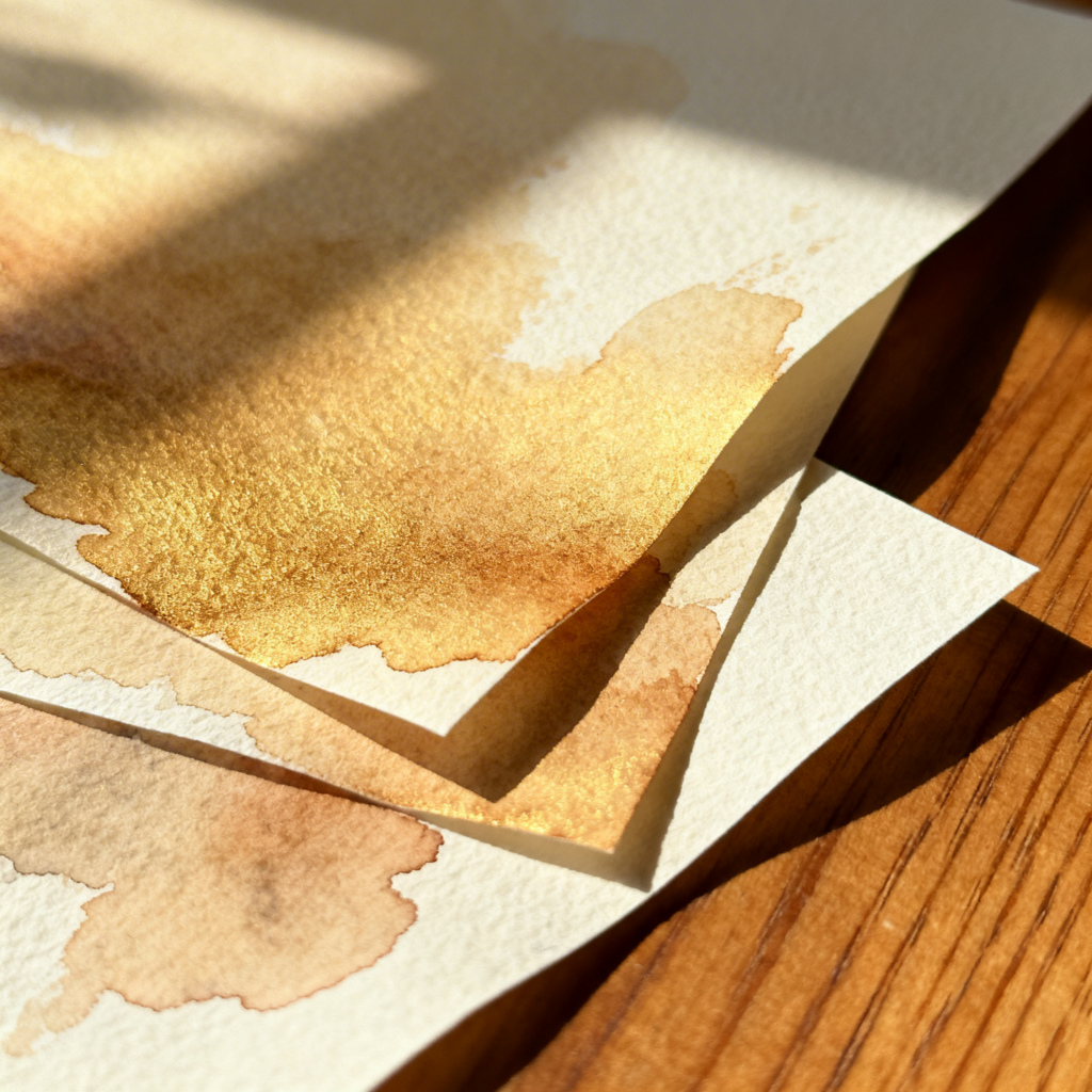 La texture du papier influe fortement sur la manière dont l’aquarelle se dépose et se fond. Le grain fin, souvent appelé Cold Press, propose une surface légèrement texturée, équilibrant détails et absorption. Il est polyvalent et convient à la plupart des sujets, des paysages aux portraits. Le grain torchon, plus marqué, est idéal pour les lavis expressifs et les effets de matière. Les papiers lisses, dits Hot Press ou satinés, offrent une surface plane et uniforme pour les détails fins mais demandent une technique plus maîtrisée afin de contrôler la diffusion de l’eau et des pigments.