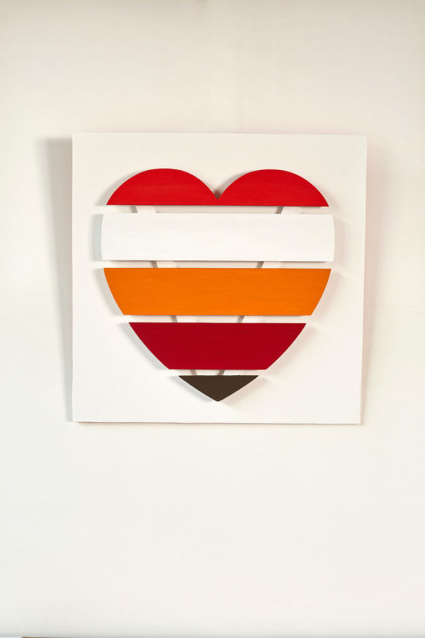 L’un des tableaux représente un grand cœur stylisé aux bandes de couleurs, un autre juxtapose des cartes de jeu revisitées et des cœurs en relief, tandis que le dernier affiche fièrement le mot LOVE, entouré de symboles colorés.