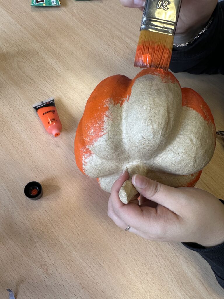 Tout d’abord, appliquez une couche uniforme de peinture orange sur toute la citrouille avec un gros pinceau. Cette base lumineuse donnera à votre déco une vraie allure festive.