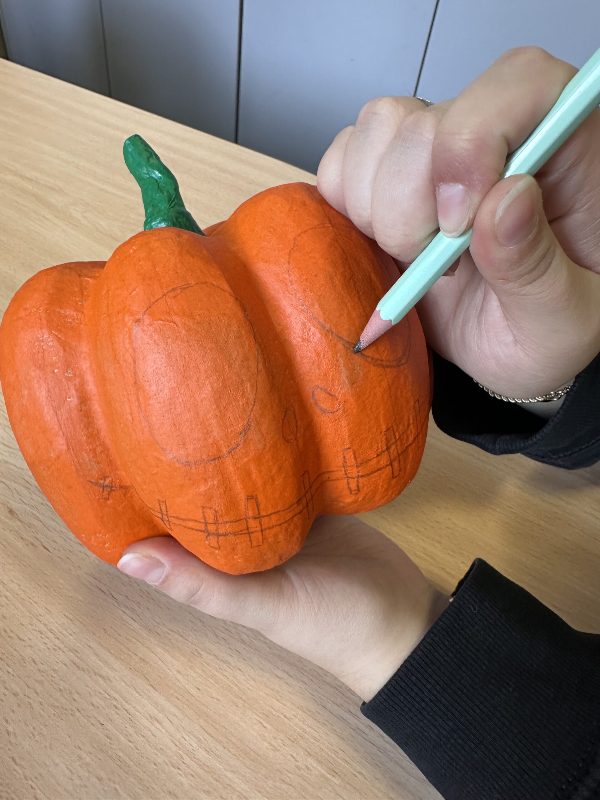 Avec un crayon à papier, esquissez le visage de votre citrouille. Vous pouvez choisir un style effrayant ou amusant, selon l’ambiance que vous souhaitez créer.