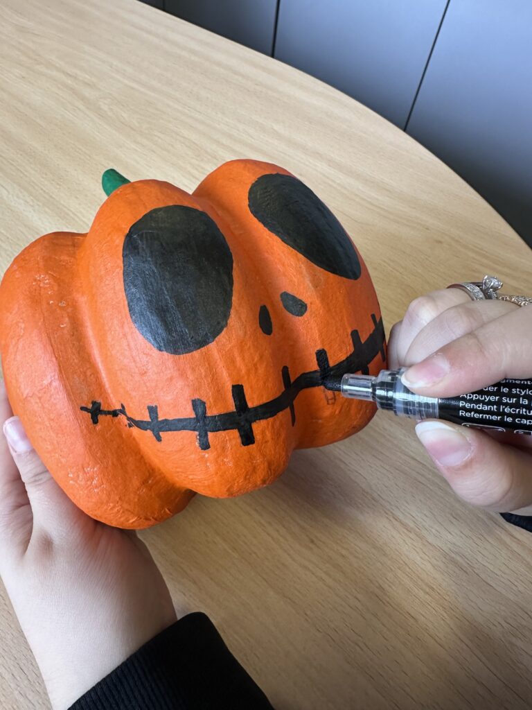 Repassez les contours des yeux et de la bouche avec un feutre noir, puis remplissez l’intérieur pour un effet net et précis.