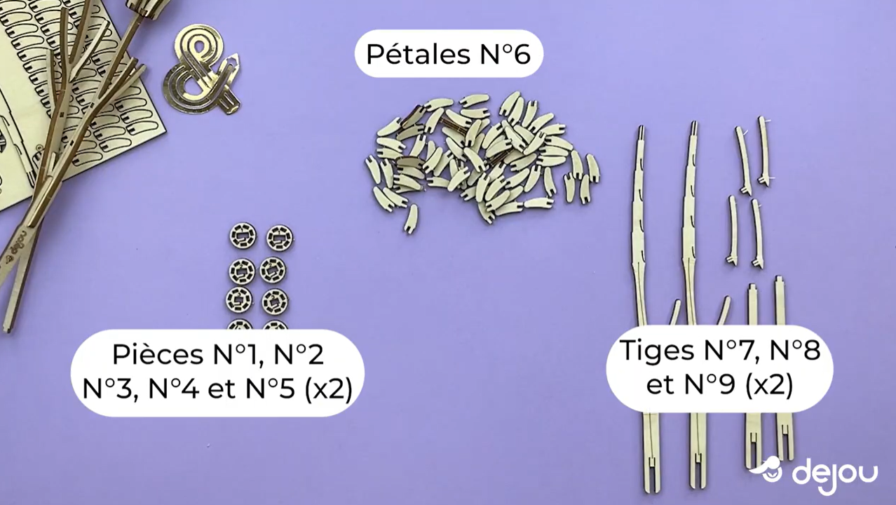 Tout d’abord, détacher toutes les pièces nécessaires à votre lavande en bois et organisez-les. Cette préparation simple rendra le montage de votre fleur plus fluide.