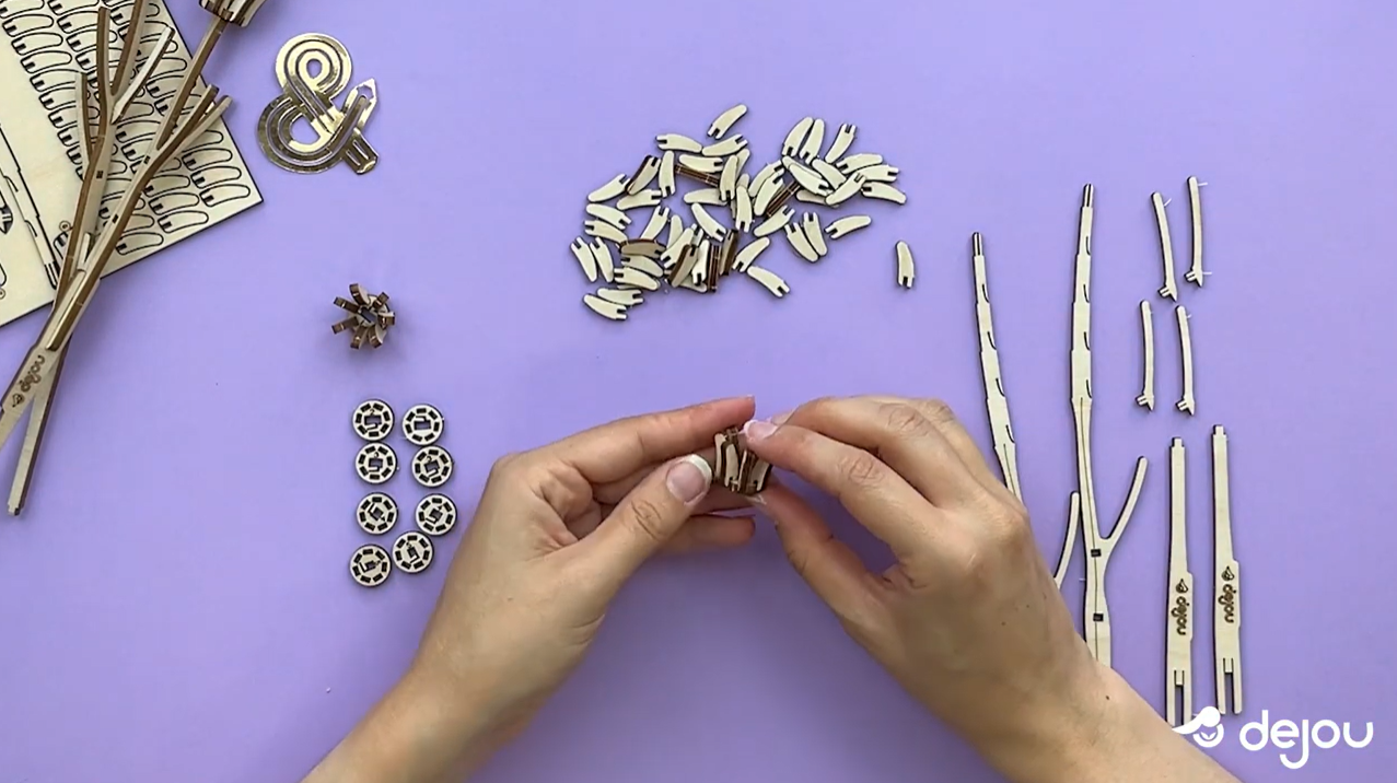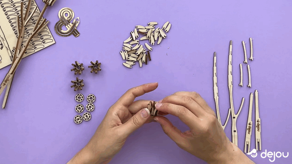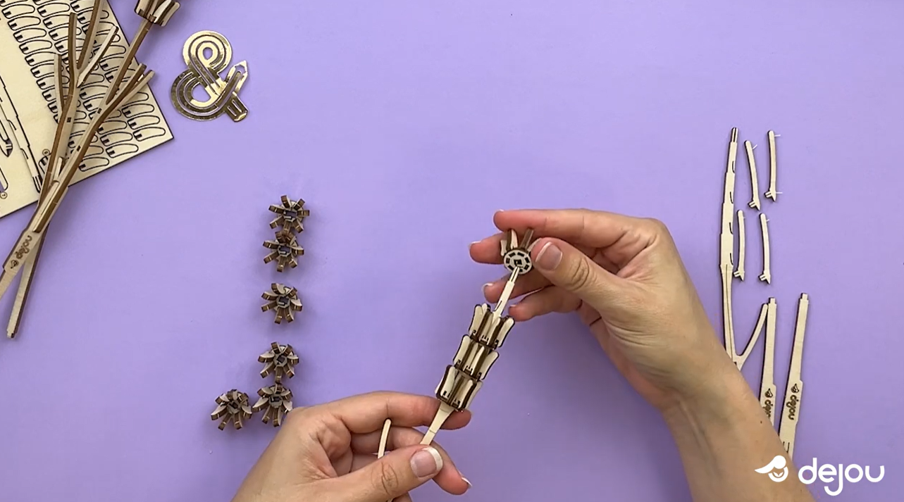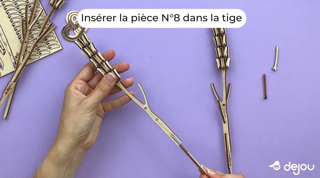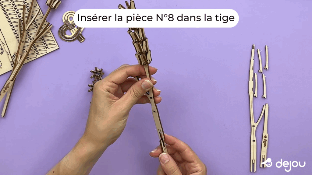 Ensuite, insérez la pièce n°8 sur la tige, puis placez les pièces n°9 afin de finaliser cette première fleur en bois.