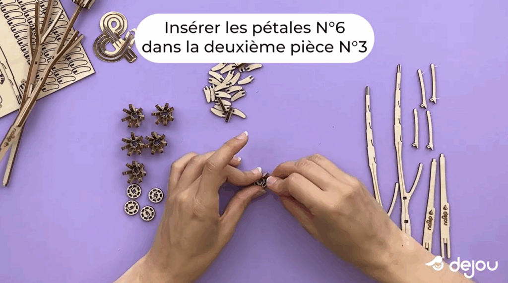 Pour donner forme à votre fleur en bois, insérez ensuite les pétales n°6 dans les pièces n°2, puis dans la seconde n°2.