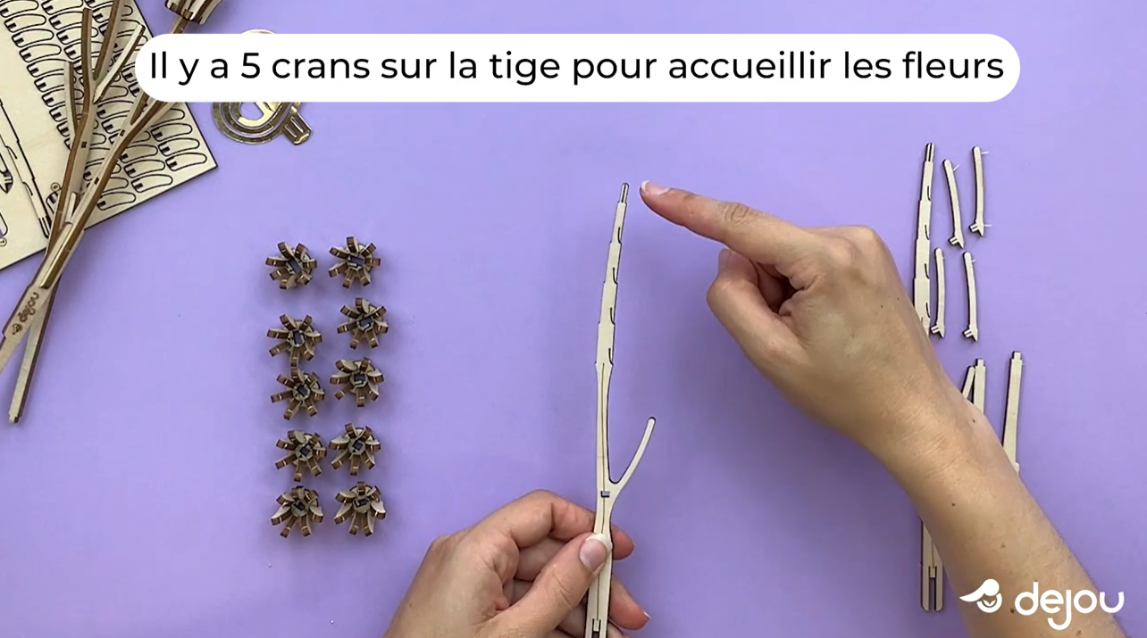 La tige comporte cinq crans conçus afin de pouvoir accueillir les fleurs en bois.