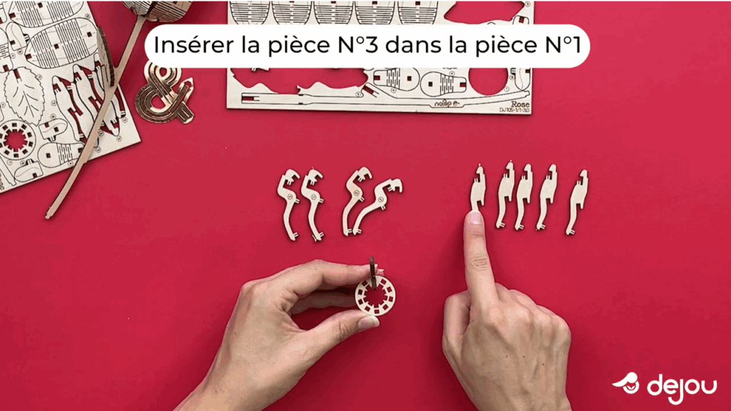 Tout d’abord, détachez la pièce n°1, qui constitue la base de la rose en bois. Puis détachez également les pièces n°2 et n°3.