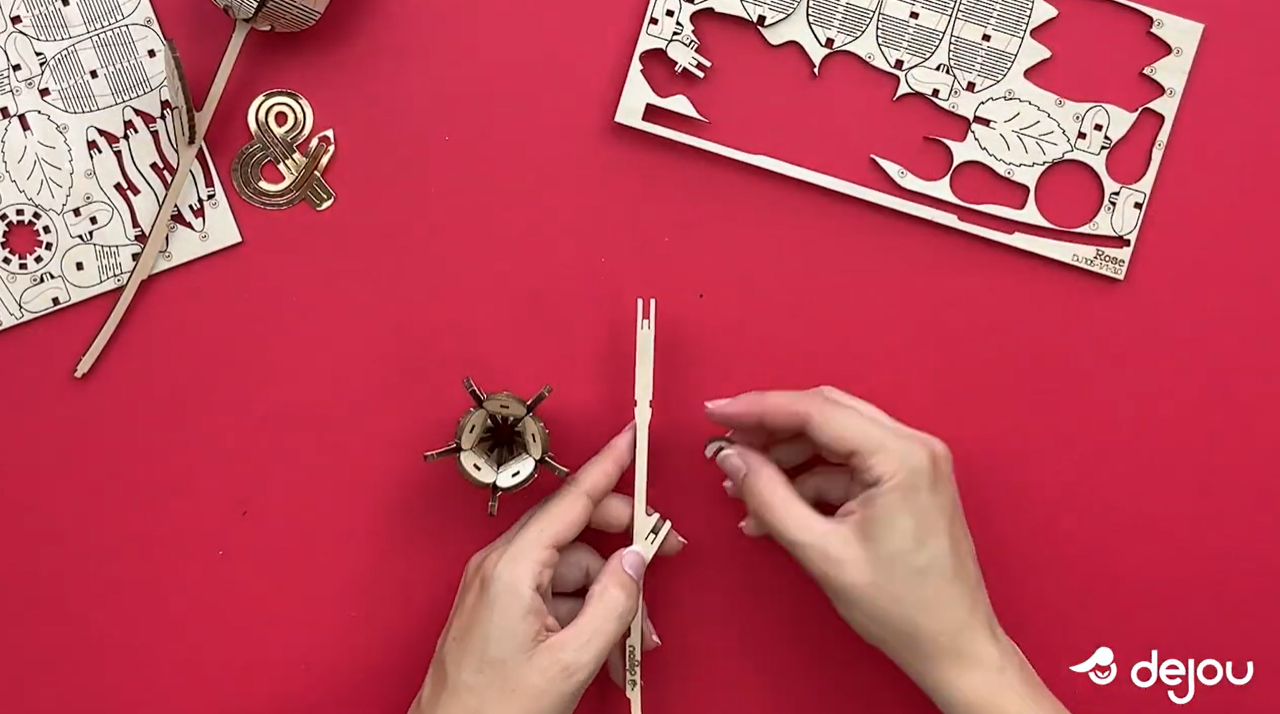 Une fois l’ensemble prêt, insérez cette tige sous la fleur en bois pour relier les deux parties.