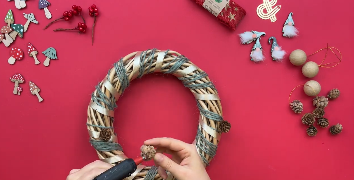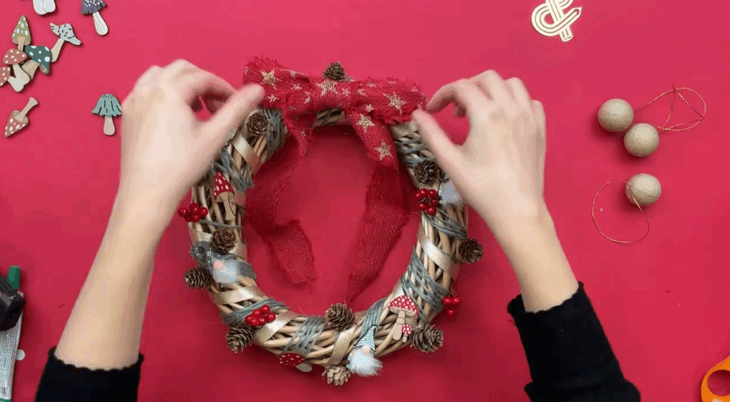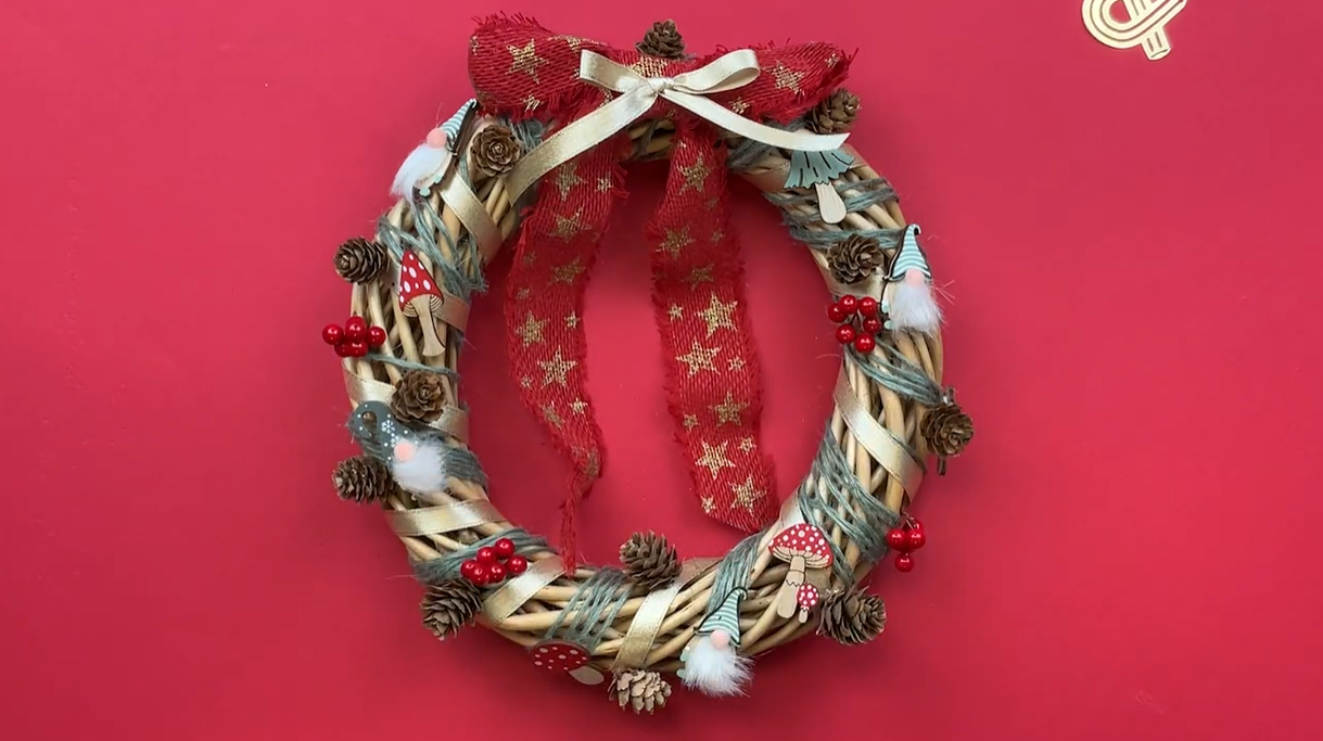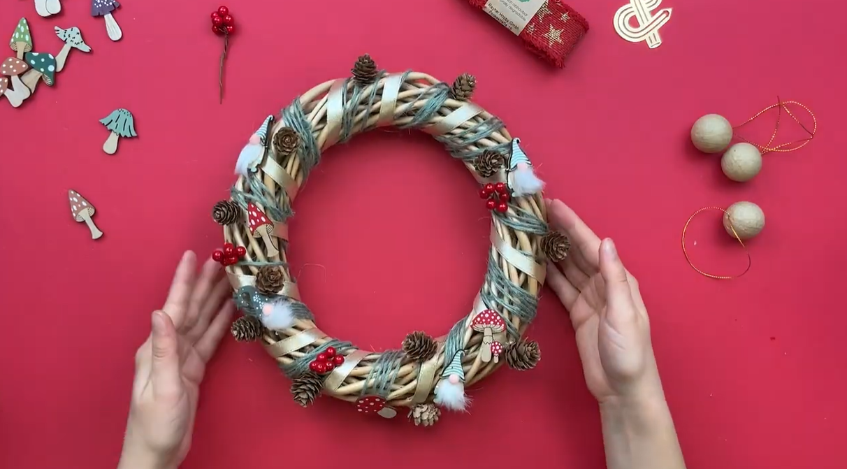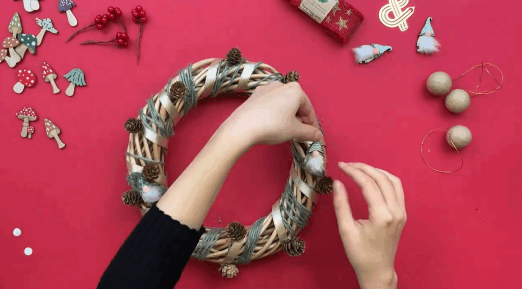 Dans le but de donner un côté forêt magique, ajoutez des champignons et des gnomes décoratifs. Ensuite, collez quelques petites boules rouges. Ainsi, votre couronne de Noël en osier gagne en couleur et en dynamisme.