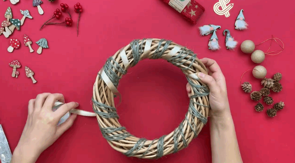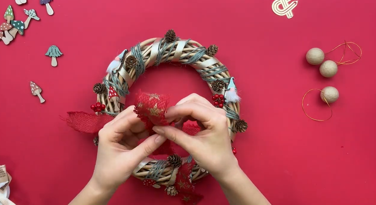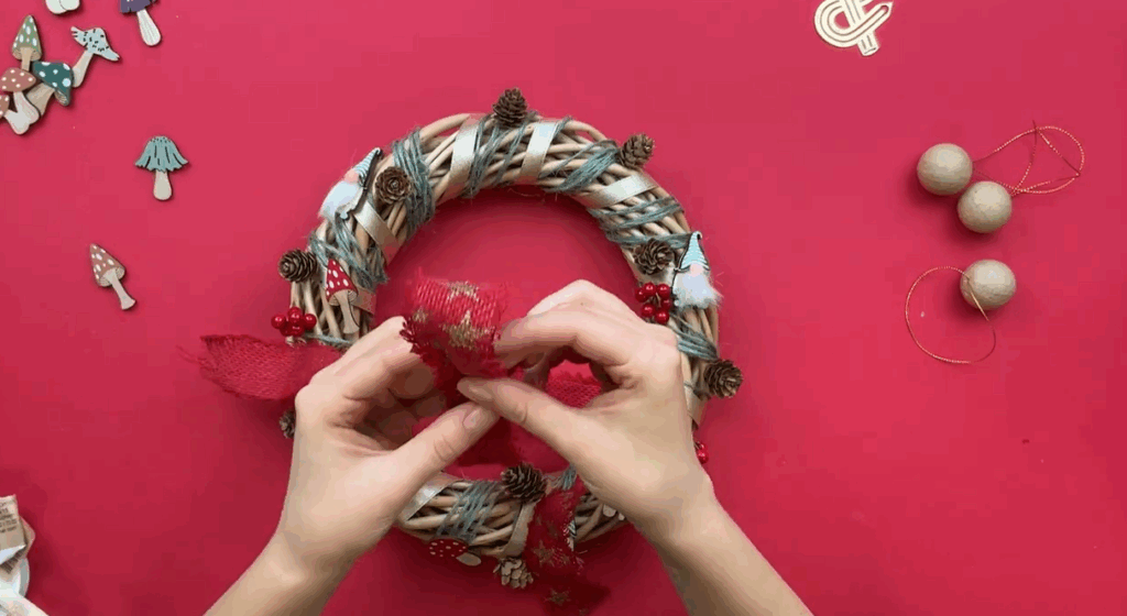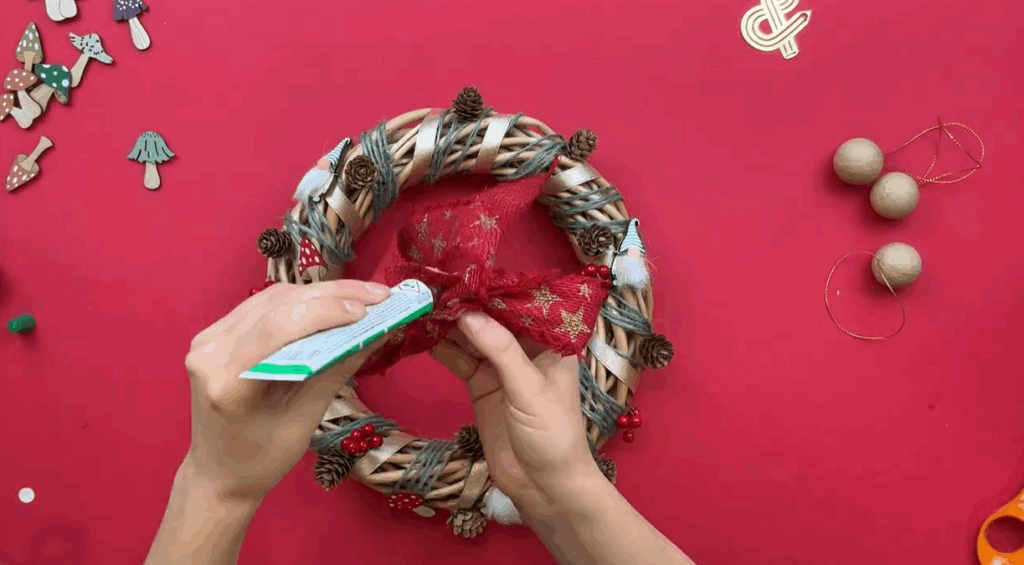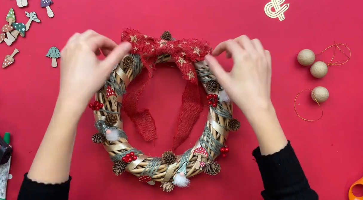 Dans le but de donner un côté forêt magique, ajoutez des champignons et des gnomes décoratifs. Ensuite, collez quelques petites boules rouges. Ainsi, votre couronne de Noël en osier gagne en couleur et en dynamisme.