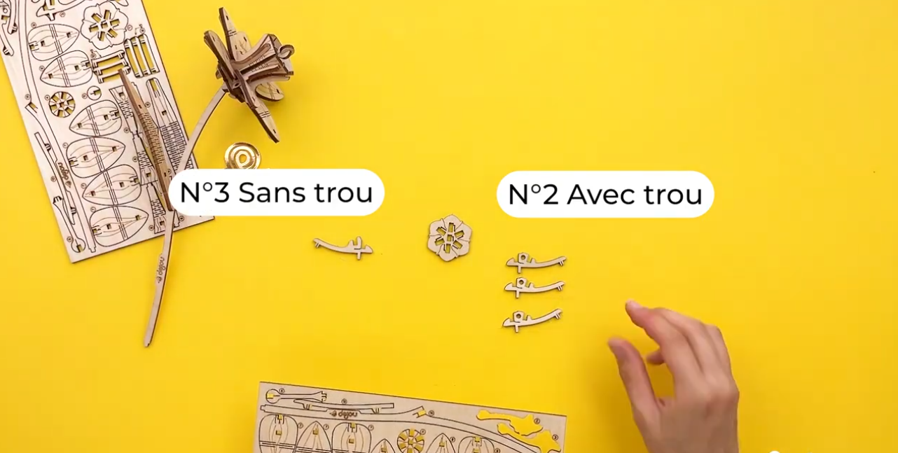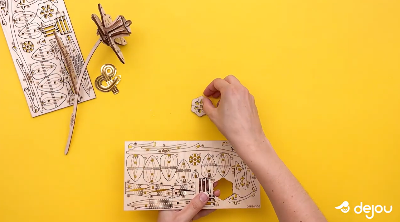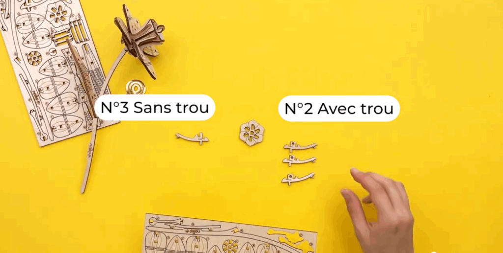 Tout d’abord, détacher la pièce numéro 1 pour commencer votre maquette fleur en bois.