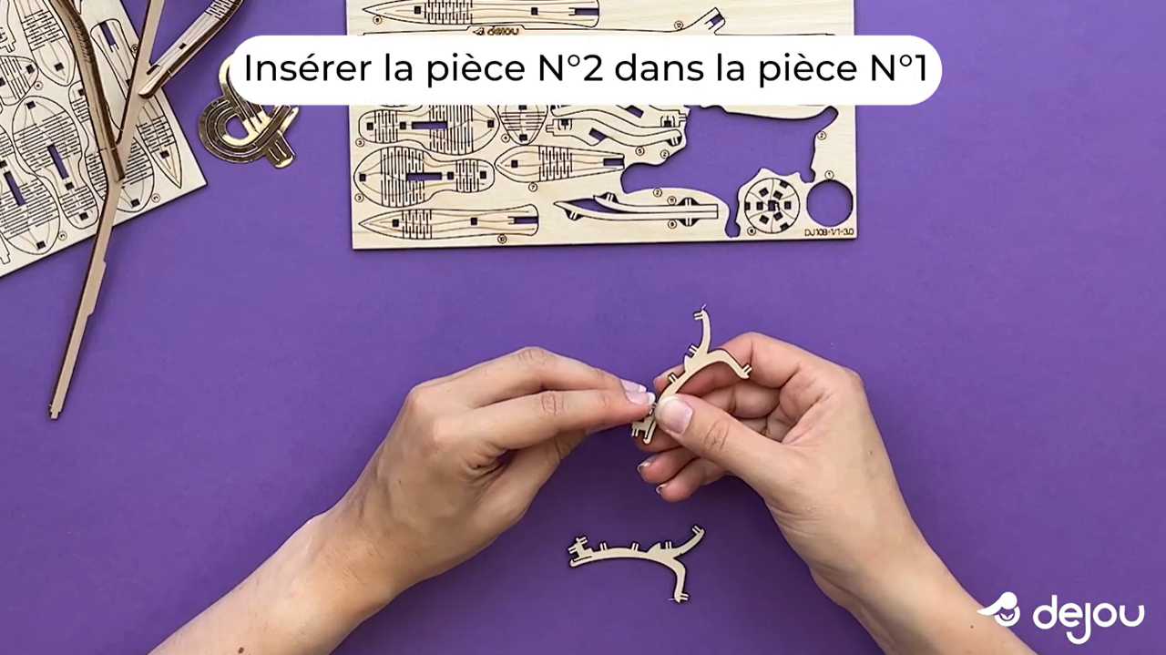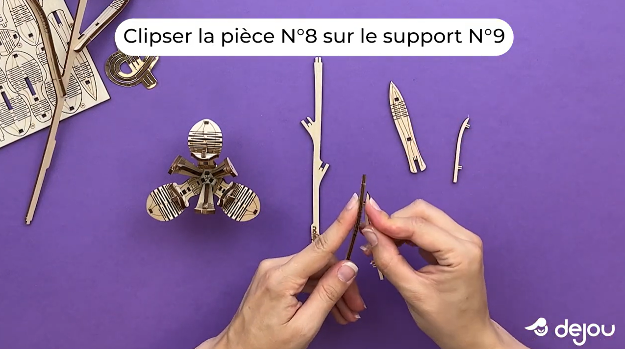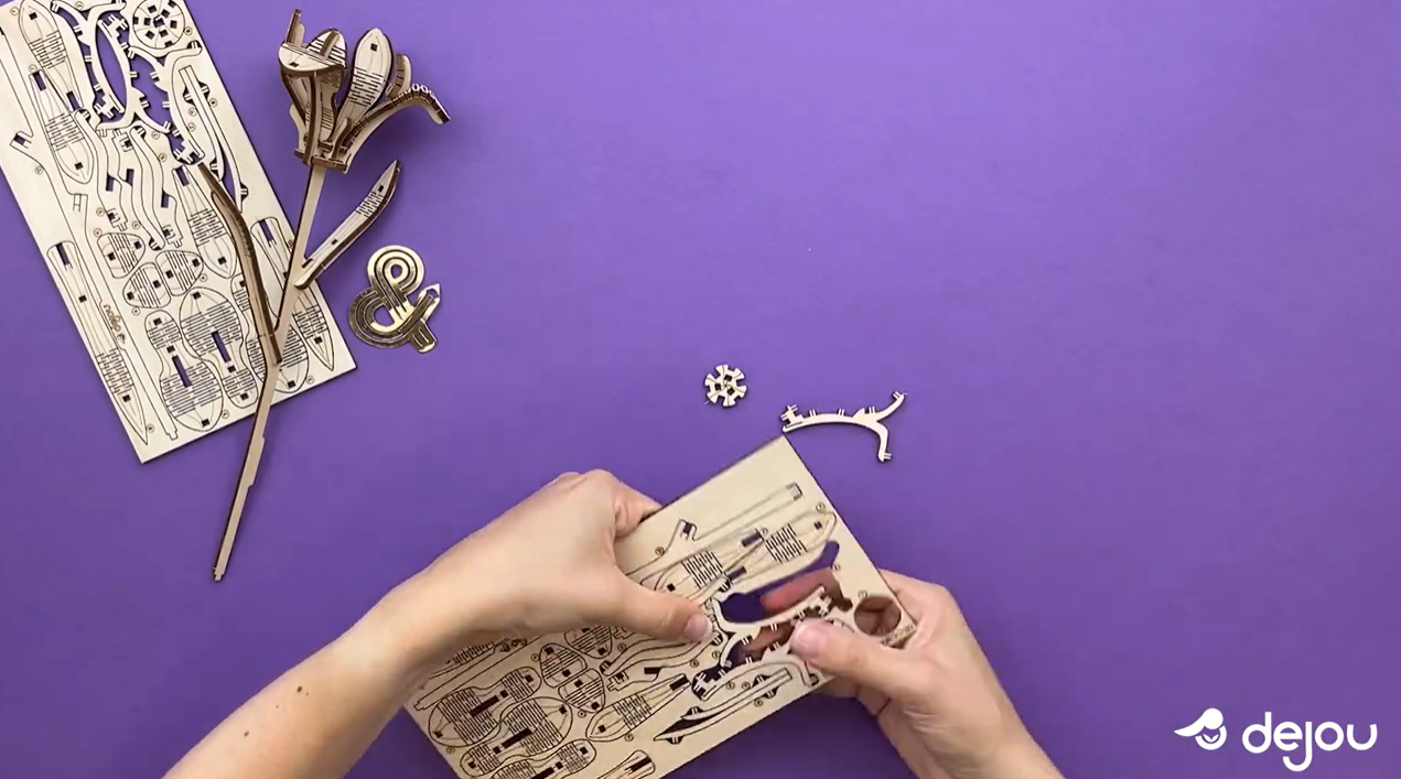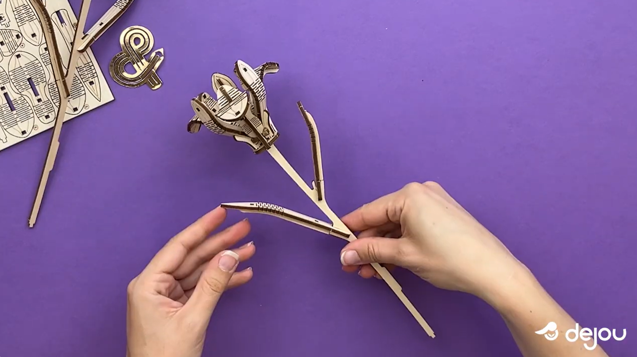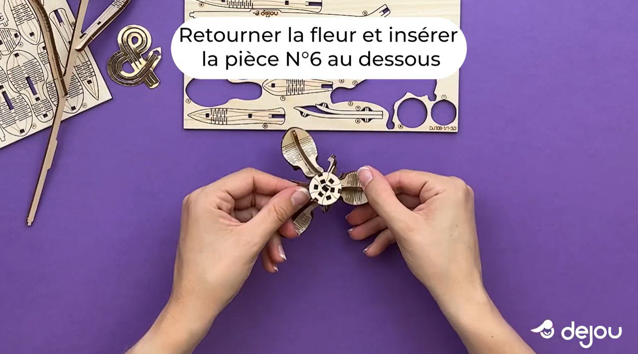 Insérez ensuite cette pièce dans les encoches situées sous la fleur en bois, jusqu’à ce qu’elle soit correctement maintenue.