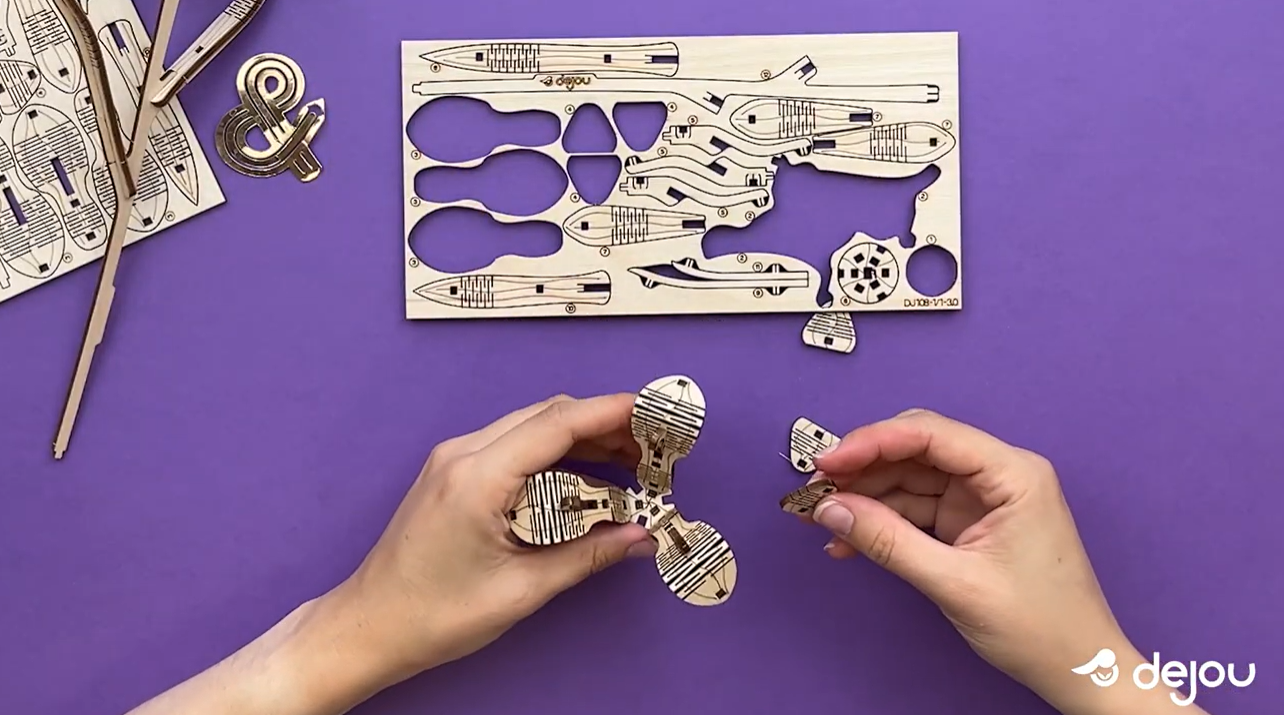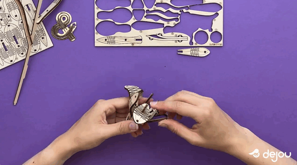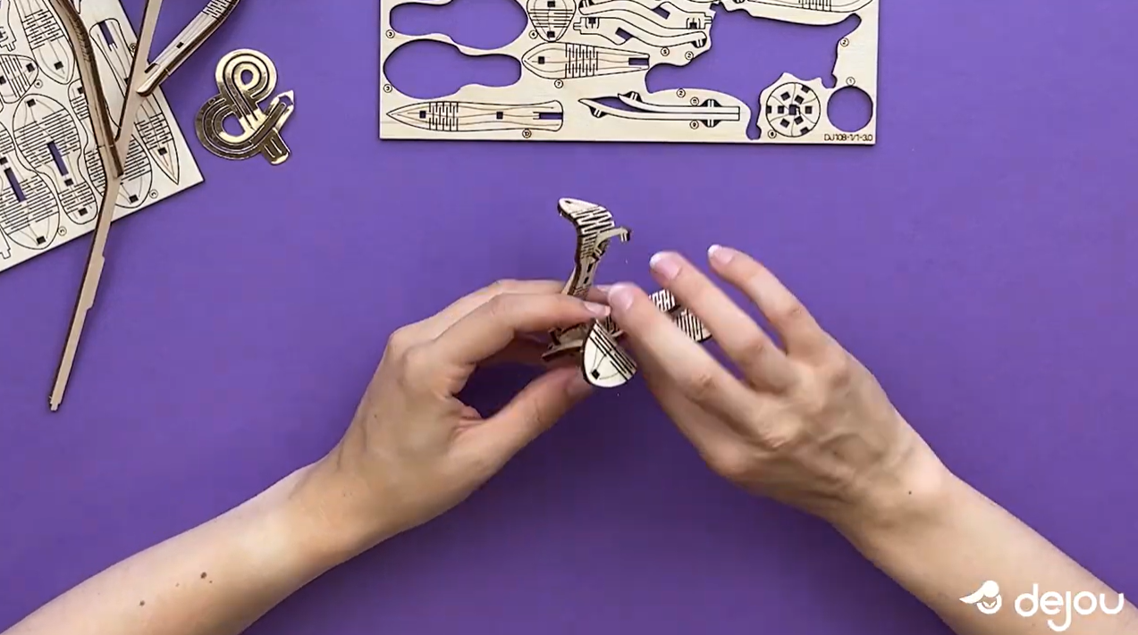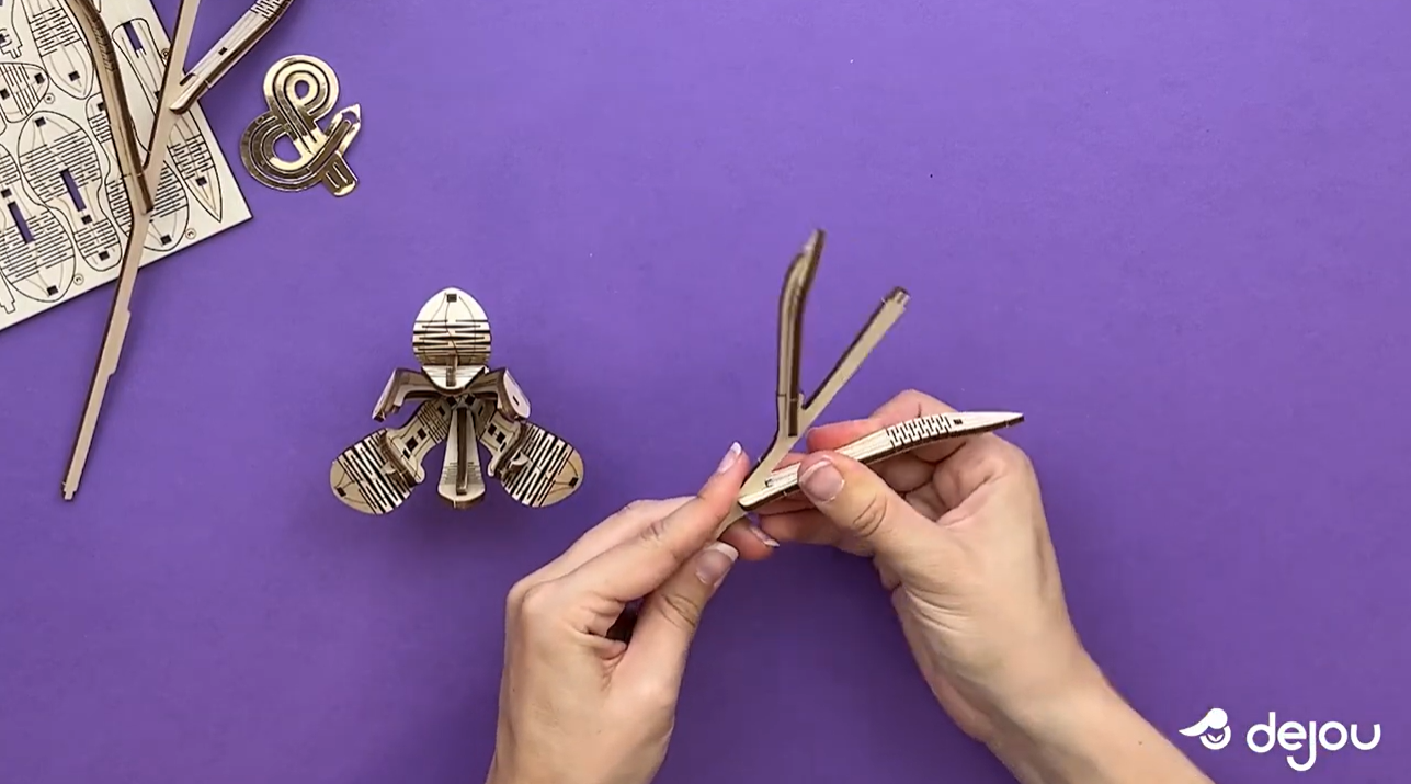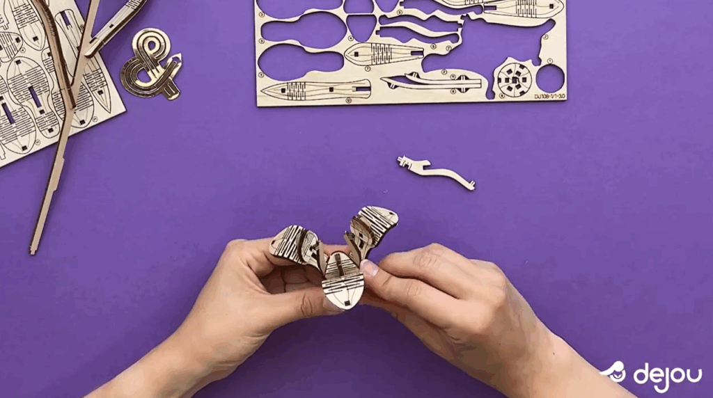 Insérez ensuite cette pièce dans les encoches situées sous la fleur en bois, jusqu’à ce qu’elle soit correctement maintenue.