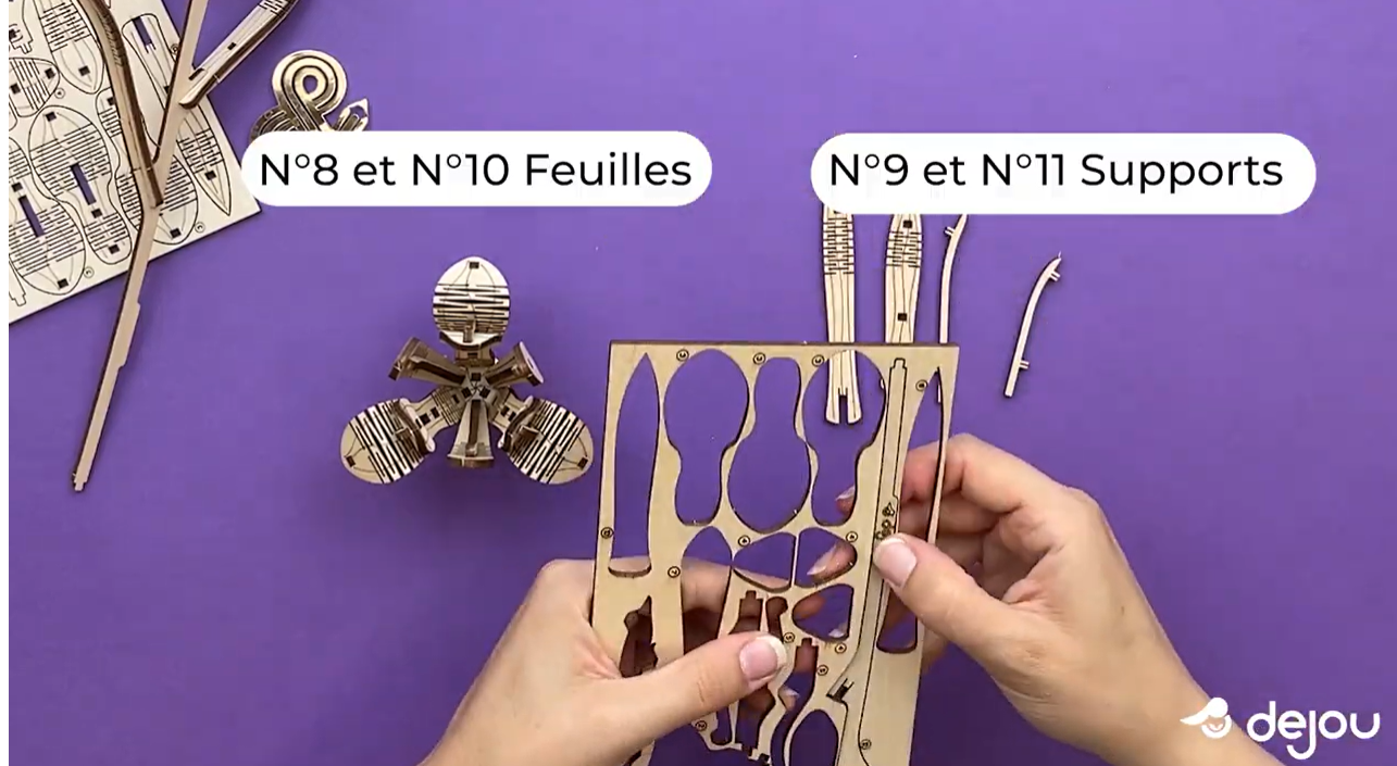 Détachez les pièces n°8, 9, 10 et 11. Les pièces 8 et 10 sont les feuilles, tandis que les pièces 9 et 11 servent de support.