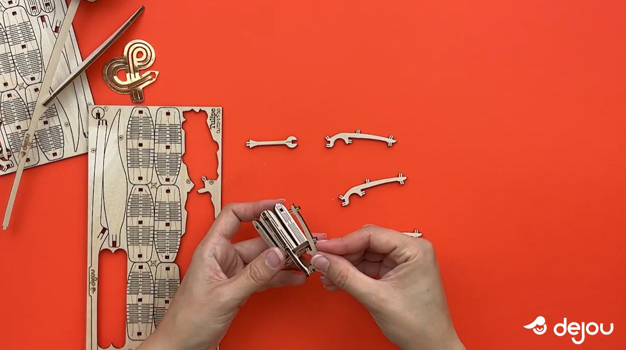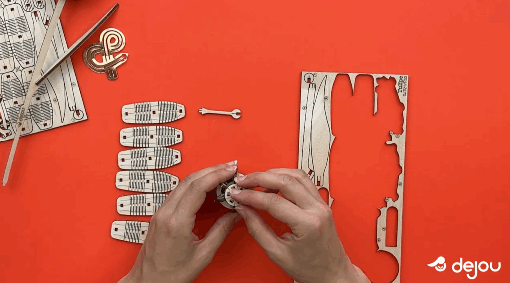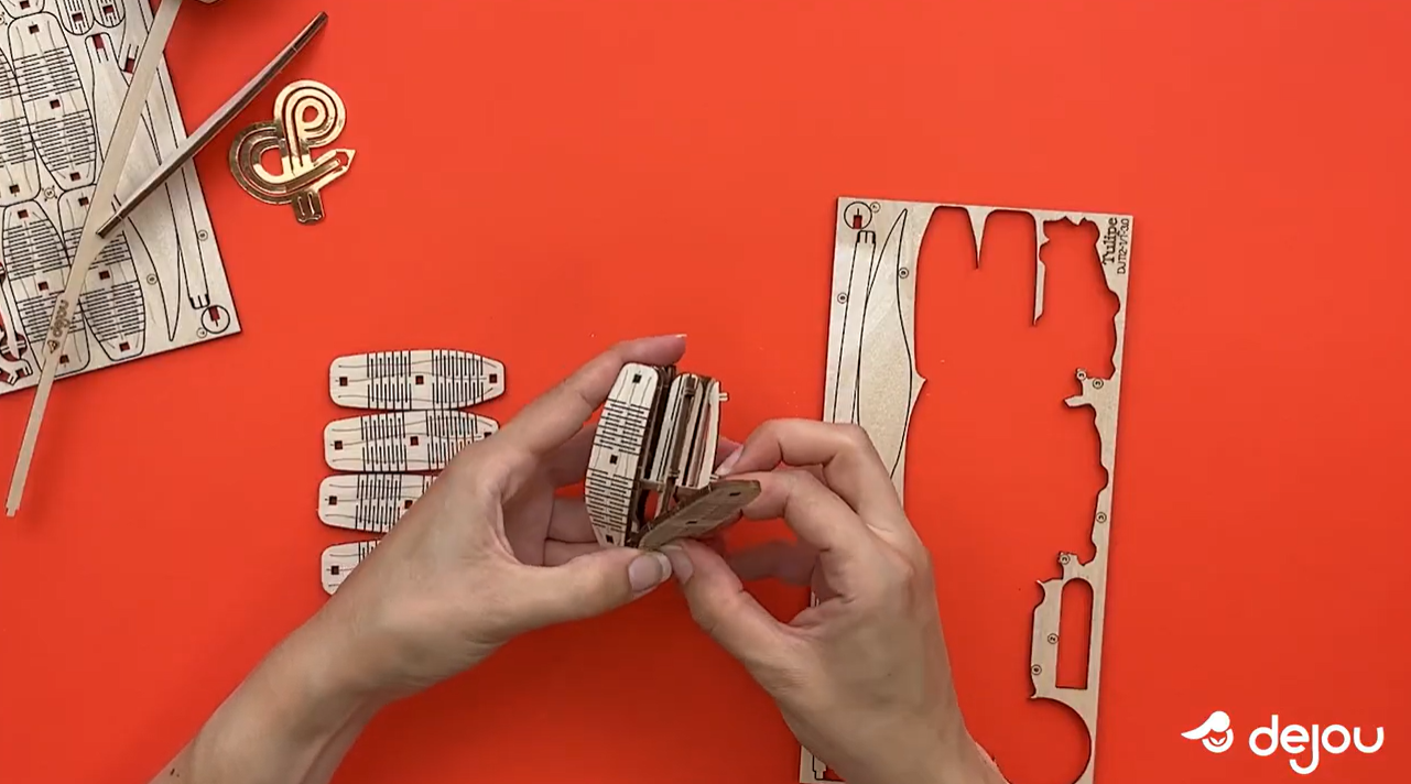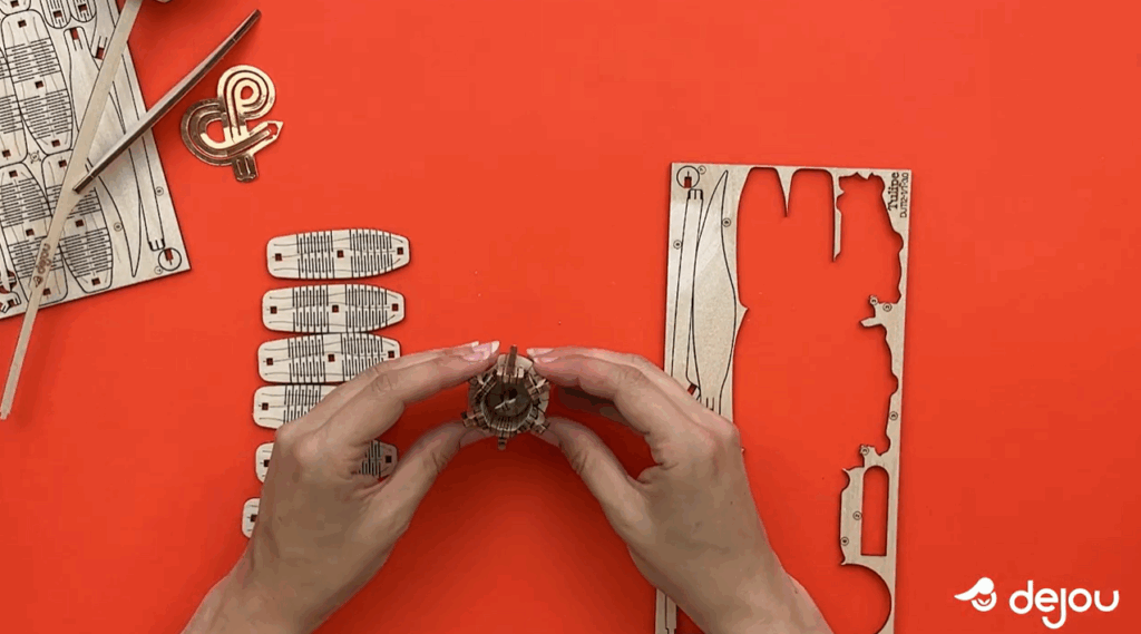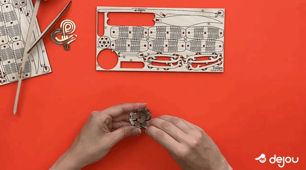 Une fois en place, clipsez ensuite les pétales de la fleur en bois dans l’encoche située sur leur partie supérieure.