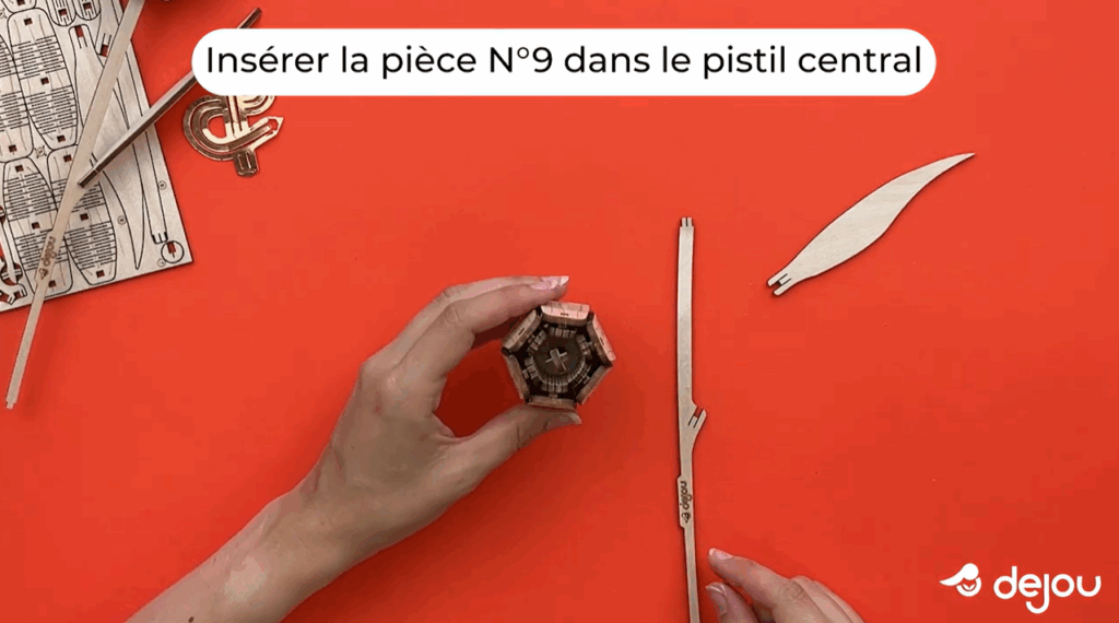 Insérez la pièce n°9 dans le pistil central afin de finaliser le cœur de la fleur.