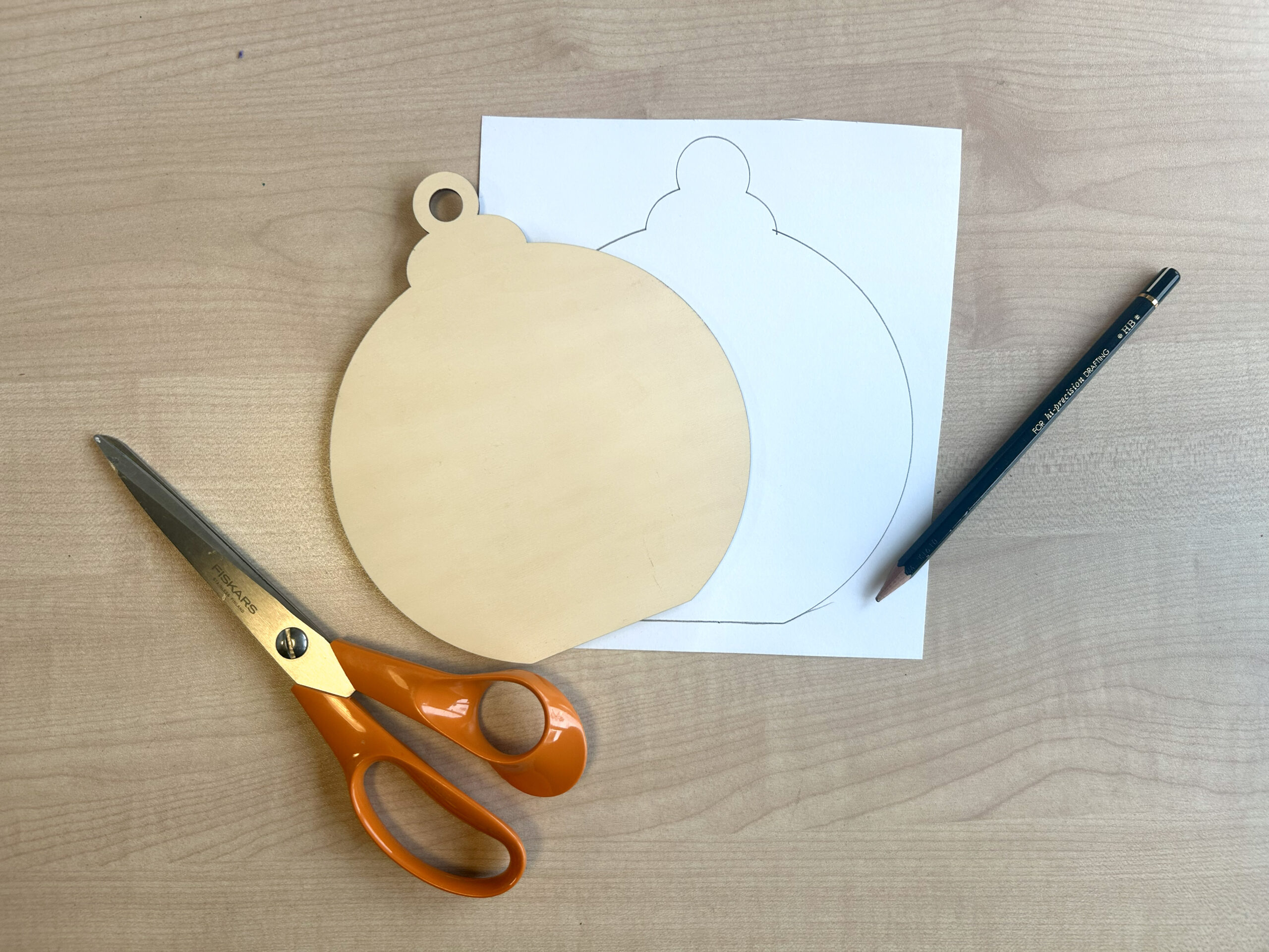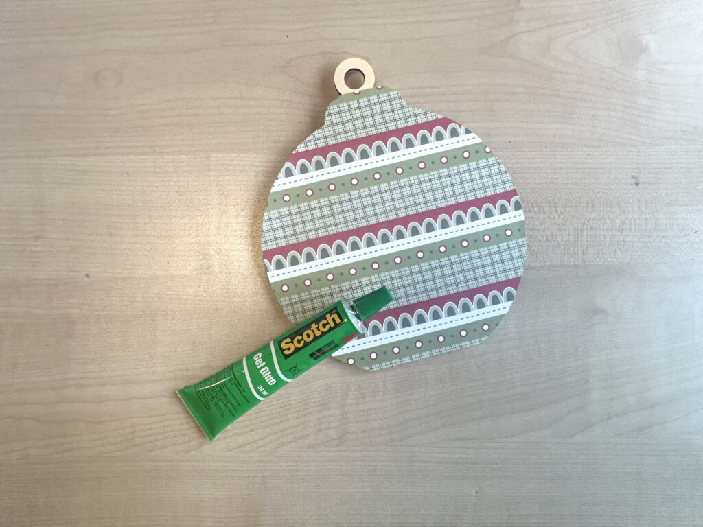Tout d’abord, retournez une feuille du bloc Woofy Christmas et tracez le contour de la boule en bois. Cela vous permettra d’adapter parfaitement le papier à la surface.