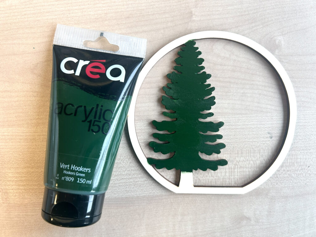 Ensuite, avec la peinture acrylique fine Crea, peignez le petit sapin gravé dans la boule. Puis, choisissez des couleurs festives comme le vert sapin et le blanc pour un effet enneigé.