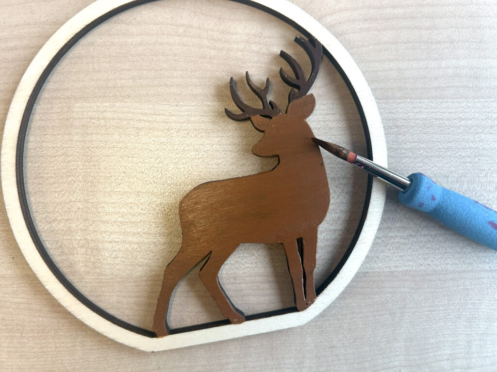 Peignez les cerfs en bois avec des teintes naturelles ou légèrement stylisées selon votre goût. Prenez soin des détails pour que les animaux ressortent bien sur le fond.