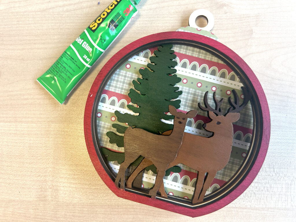 Ensuite, appliquez de la colle Scotch Gel Universelle au dos du papier et fixez-le sur le fond de la boule en bois. Assurez-vous que le papier adhère bien à toutes les surfaces afin de donner un rendu net.