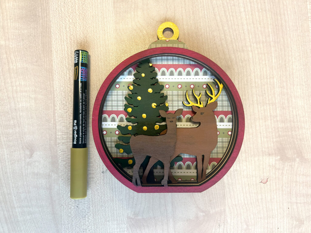 Utilisez le marqueur doré afin de tracer de petites touches brillantes sur le sapin, les cerfs ou autour des bords. Cela apportera ainsi une finition raffinée et festive.