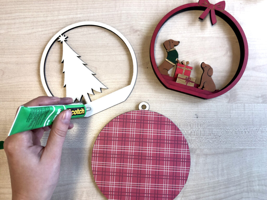 Tout d’abord, découpez un motif du bloc de papier Woofy Christmas aux dimensions exactes de la boule en bois. Puis, collez-le soigneusement avec la colle Scotch Gel Universelle. Cette étape garantit une base solide et permet d’intégrer des motifs festifs dès le départ.