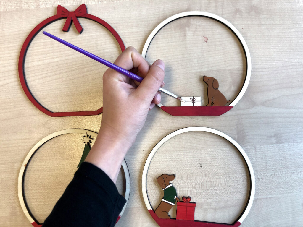 Ensuite, appliquez la peinture acrylique fine Crea sur les cadres et zones en relief de la boule. Utilisez des couleurs chaudes et de saison pour donner vie à votre décoration : rouge, vert sapin, blanc nacré ou bien bleu ciel. Prenez votre temps afin de peindre chaque détail afin d’obtenir un rendu net et harmonieux.